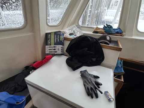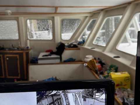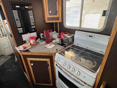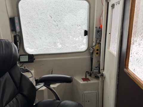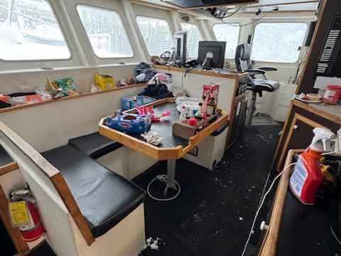 • Galley in wheelhouse with cupboards, lockers, countertop, sink and table, electric stove. Sinks.